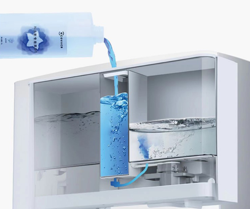 Sản phẩm được cấu tạo thùng lọc nước thải, bể nước trong suốt và cảm biến; phao và cảm biến trong bể nước sạch mang tới khả năng bảo vệ chống tràn, đồng thời thiết kế bộ lọc trong bể nước thải giúp giảm bụi bẩn, tắc nghẽn lâu dài.
