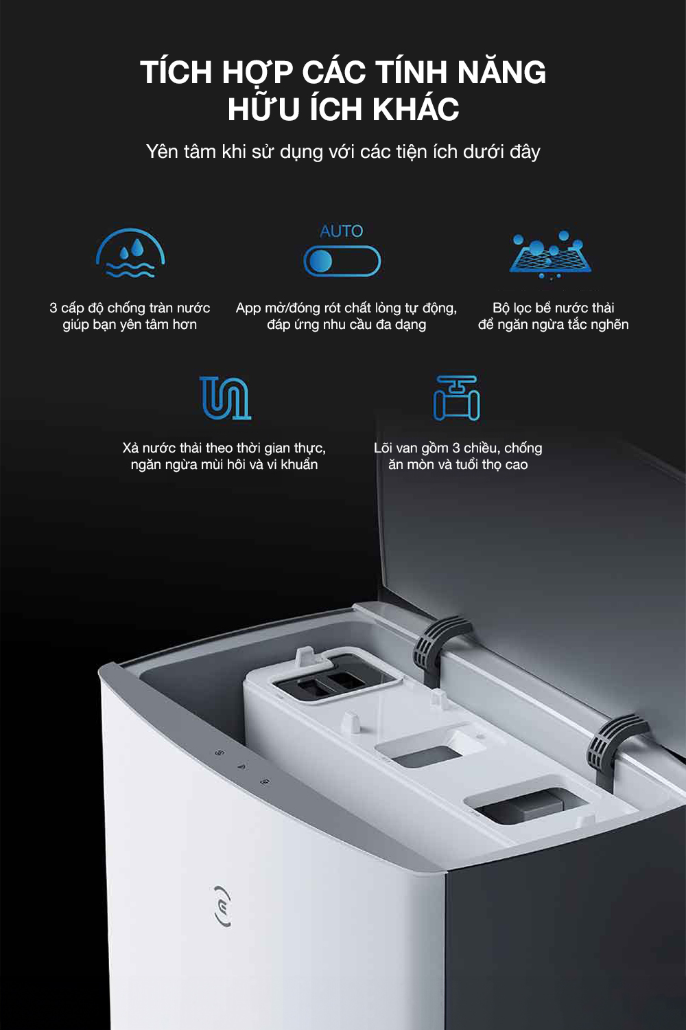Với cảm biến bảo vệ chống tràn được trang bị trên bộ cấp nước tự động, hỗ trợ thiết bị hoạt động 1 cách êm ái, vận hành trơn tru mà không gặp bất kì cản trở nào. Cùng bộ lọc với nhiệm vụ lọc sạch bụi bẩn và ô nhiễm có trong nước.