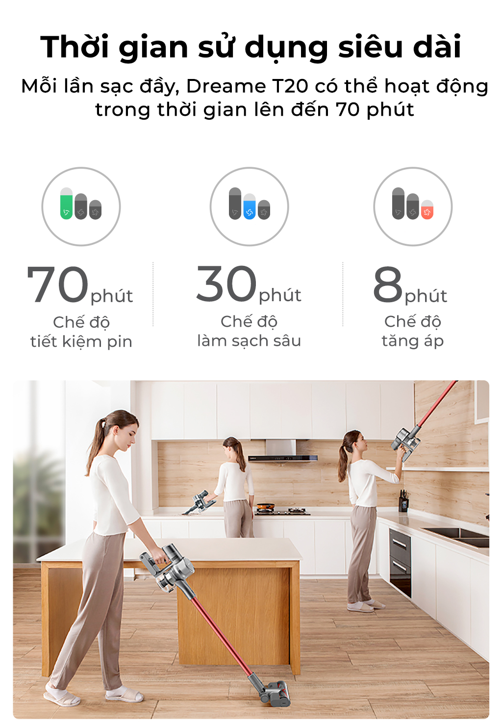 Ở chế độ hoạt động tiêu chuẩn, Dreame T20 có thể làm việc liên tục trong 70 phút, khi bật chế độ hút siêu cường, máy cũng có thể duy trì khả năng hút trong 8 phút, thời gian này đảm bảo bạn có thể hút sạch mọi chất bẩn, vết dơ hay mảnh vụn. Khi đạt giới hạn nhiệt độ cho phép, thiết bị sẽ dừng và tự làm nguội, sau khi động cơ đã nguội, người dùng có thể tiếp tục sử dụng thiết bị.