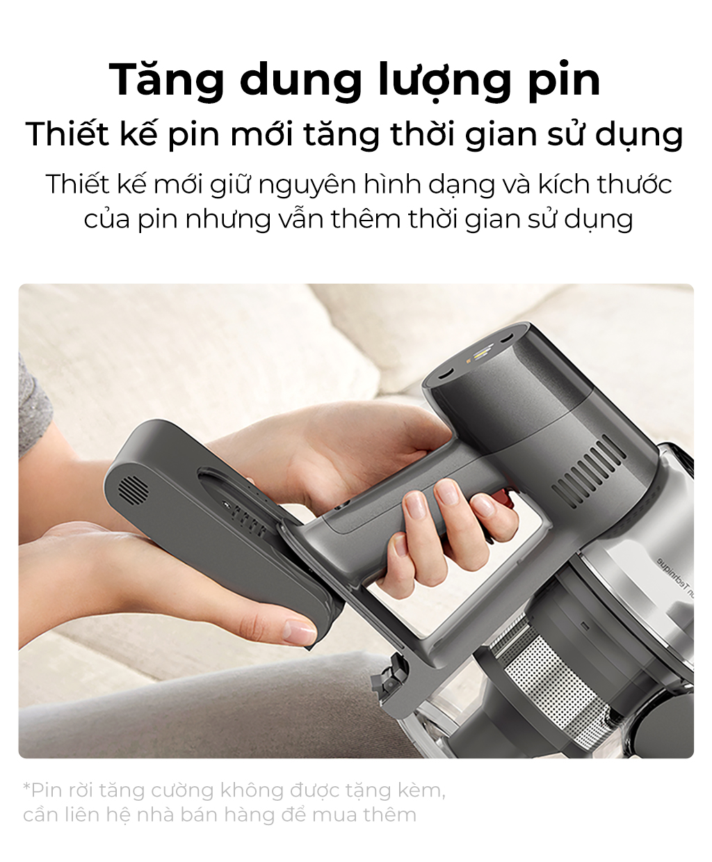 Khách hàng sử dụng Dreame T20 có thể an tâm trong việc dọn dẹp nhà cửa bởi thiết bị có nguồn pin khá dồi dào, 8*2900mAh. Diện tích tối đa mà Dreame T20 có thể dọn dẹp lên đến 300m2