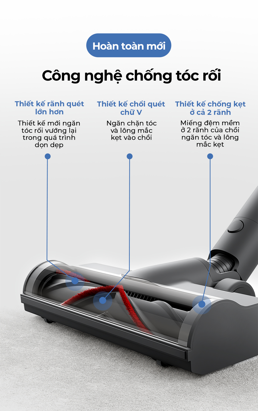 Dreame còn trang bị thêm cho T20 bộ vòi cuộn kiểu mới thích hợp với nhiêu loại bề mặt sàn khác nhua. Trong đó, phần cuộn lăn chữ V độc đáo giúp chống lại tình trạng hút phải tóc rối, chổi chữ V giảm tóc rối khi hút vào. Ngoài ra, Dreame còn trang bị bộ lược chuyên dụng trong vòi hút giúp giảm tình trạng hút phải tóc và gây kẹt.