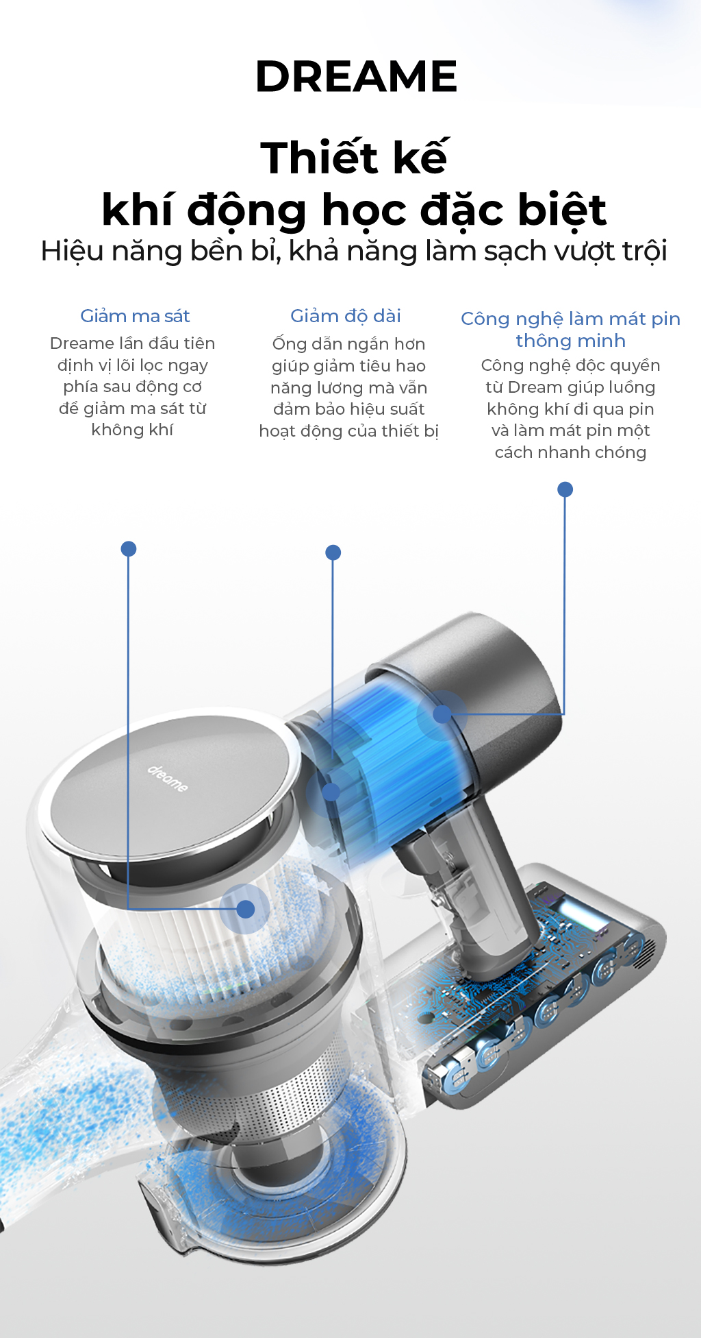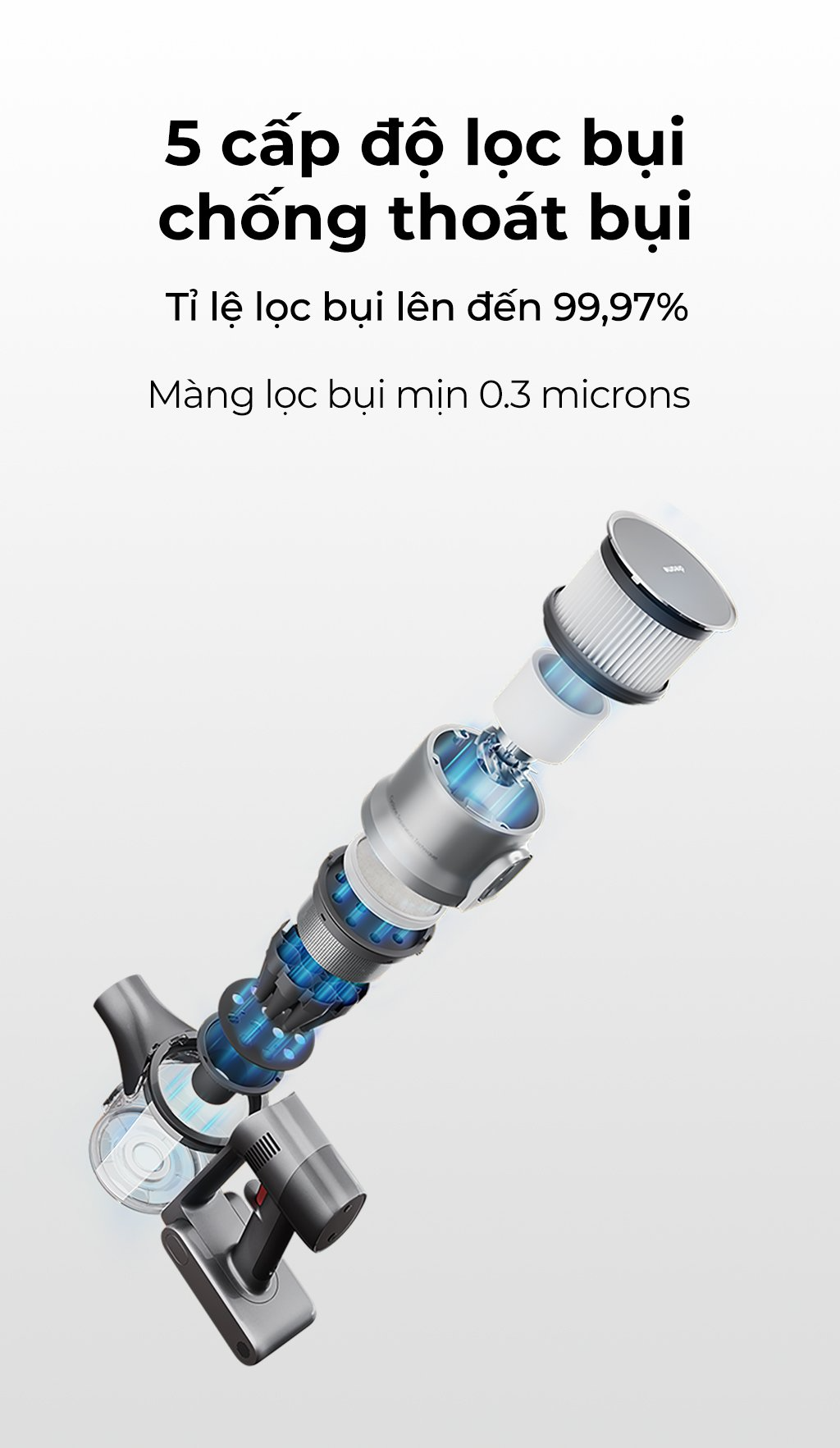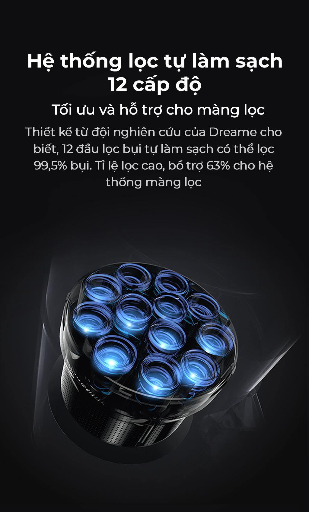 Công nghệ này được Dreame áp dụng trên sản phẩm của hãng sau khi nghiên cứu và chỉ ra rằng thiết bị có thể hút được những hạt bụi nhỏ đến 0.3 micromet, từ đó, Dreame đưa ra 5 cấp độ lọc bụi khác nhau, đi kèm với đó là thiết kế ống dẫn tách bụi đa điểm hình nón, thiết kế này cũng tạo ra khả năng lọc bụi, tách các dạng bụi khác nhau ngay cả trong quá trình bụi đi từ đầu ống hút đến khay chứa bụi.