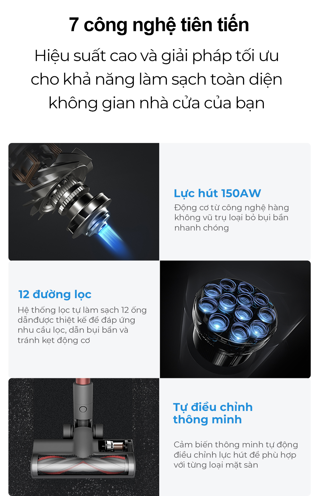 Công nghệ Speed Force trên khối động cơ SPACE 4.0 độc quyền từ Dreame tạo lục hút đo được tại đầu vòi của thiết bị lên đến 25000 Pa, công suất hút đạt 150 AW.