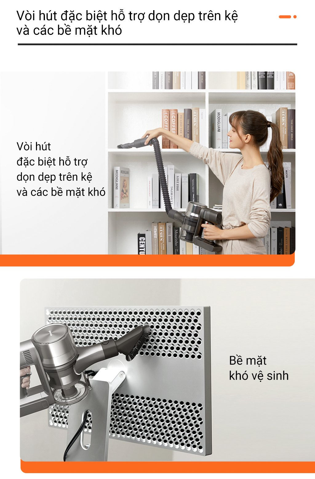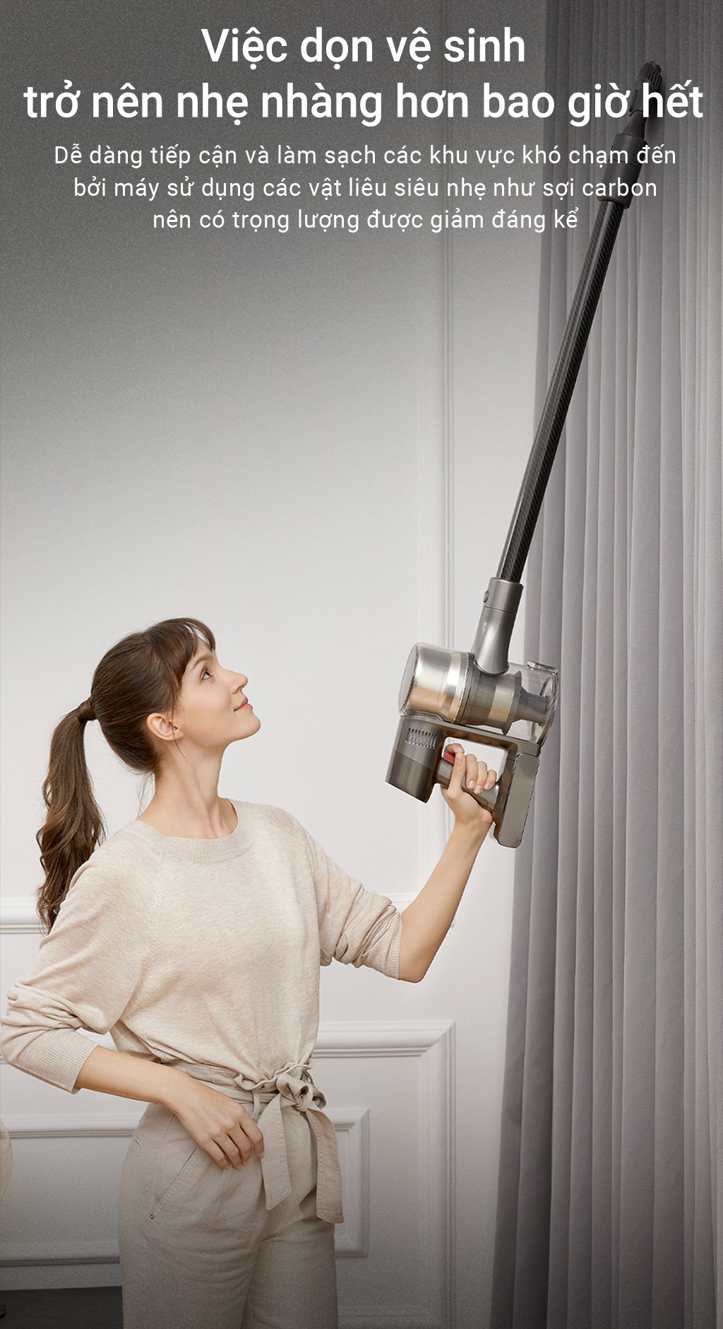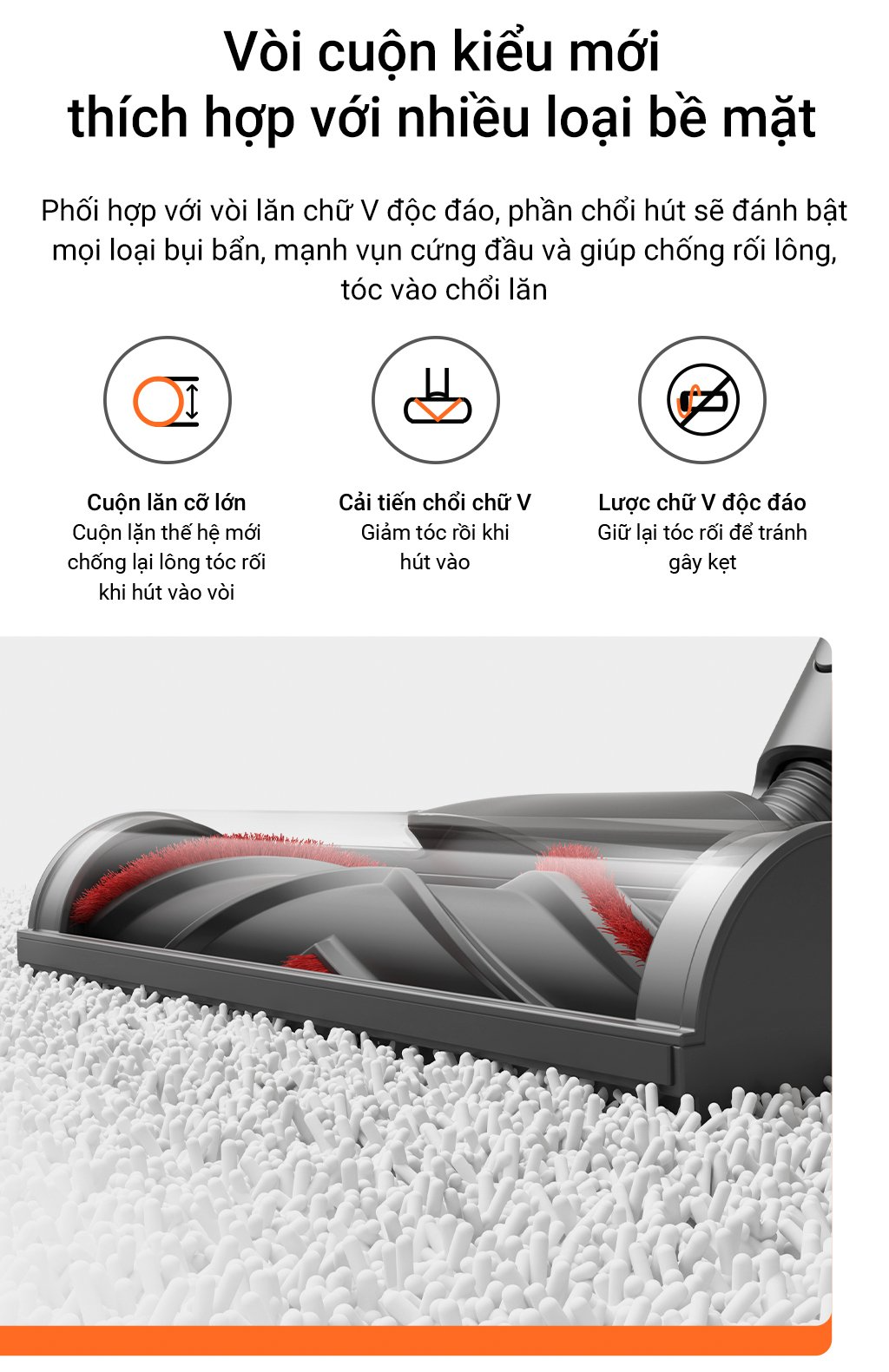 Dreame còn trang bị thêm cho T30 bộ vòi cuộn kiểu mới thích hợp với nhiêu loại bề mặt sàn khác nhua. Trong đó, phần cuộn lăn chữ V độc đáo giúp chống lại tình trạng hút phải tóc rối, chổi chữ V giảm tóc rối khi hút vào. Ngoài ra, Dreame còn trang bị bộ lược chuyên dụng trong vòi hút giúp giảm tình trạng hút phải tóc và gây kẹt.
