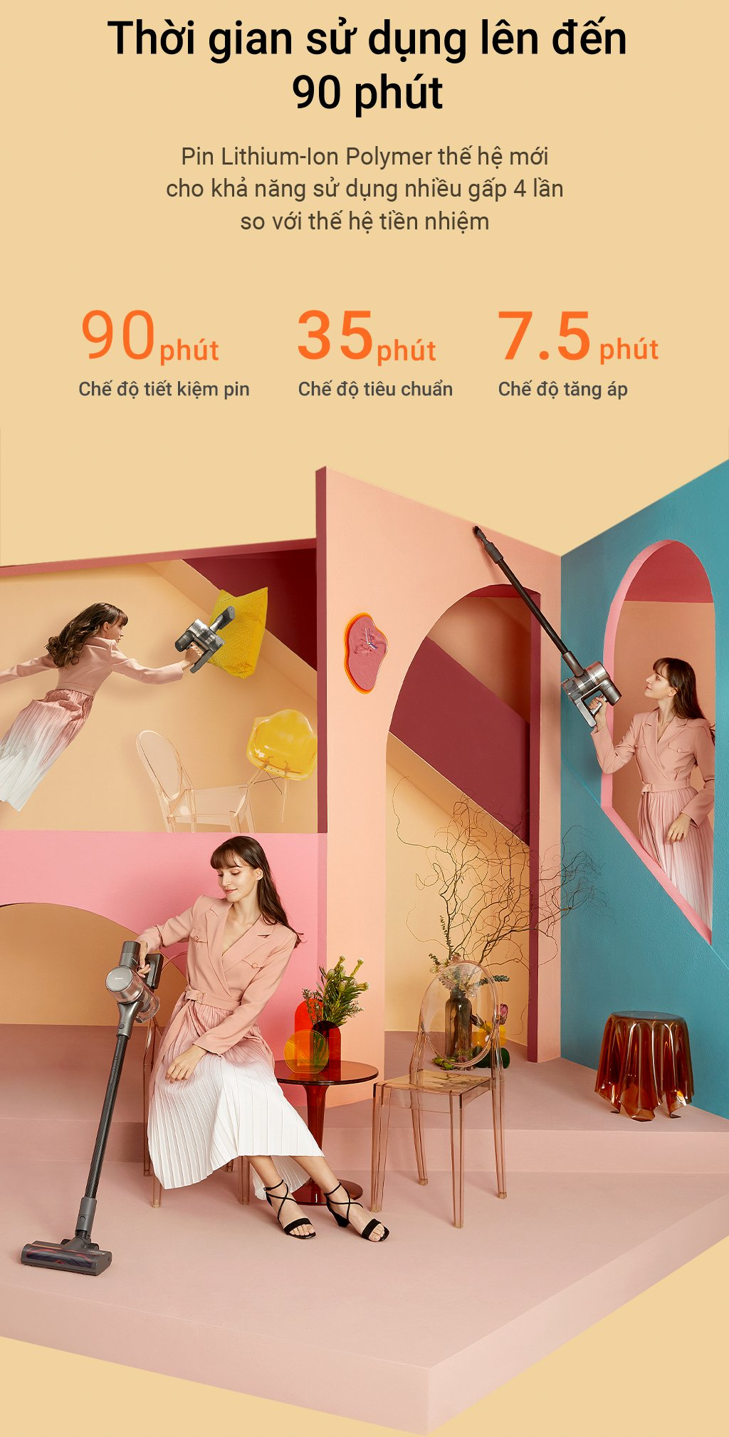 3 mức lực gồm tăng áp, tiêu chuẩn và tiết kiệm pin sẽ tương thích với 3 thời gian hoạt động 7,5, 35 và 90 phút.