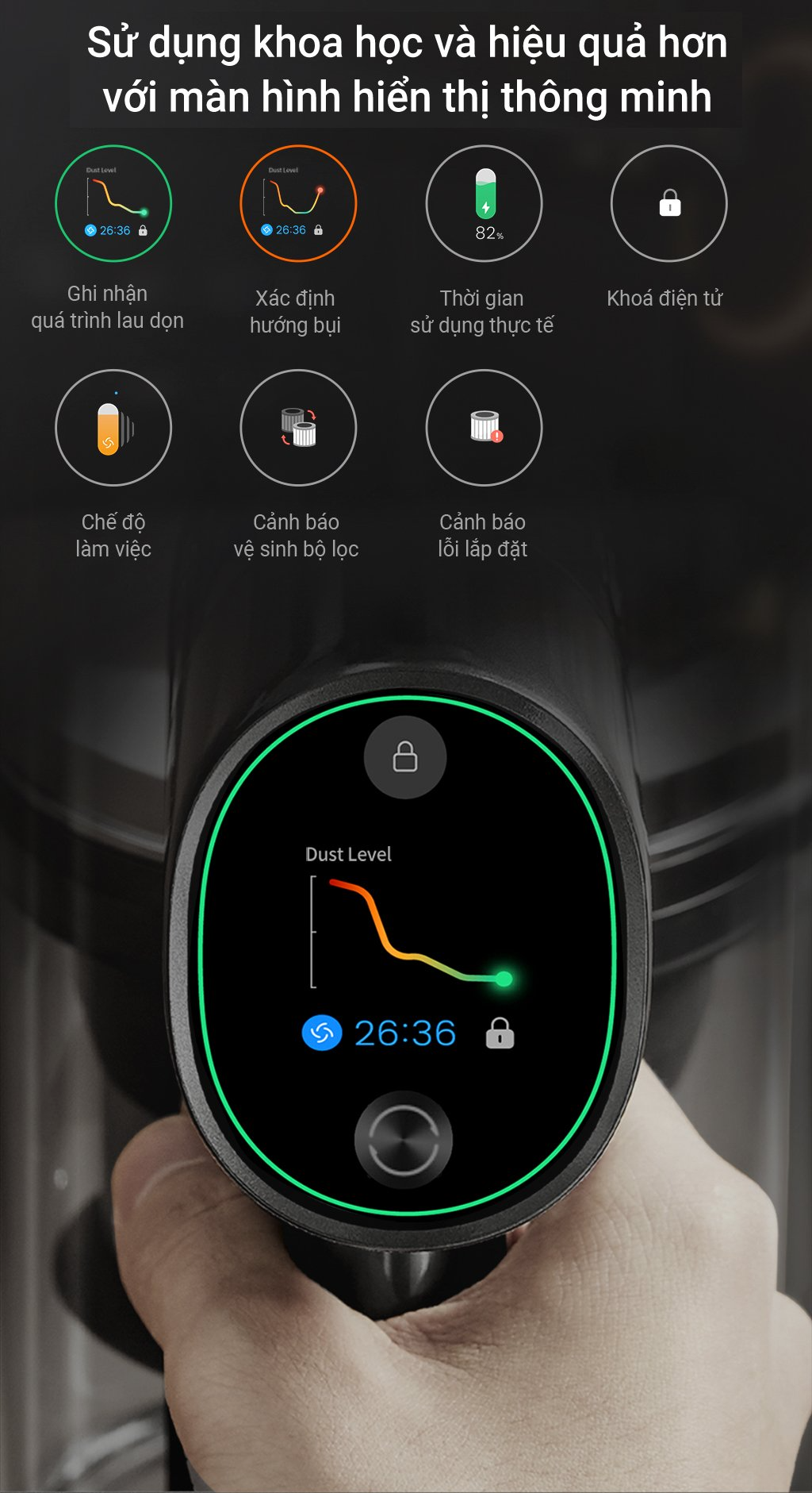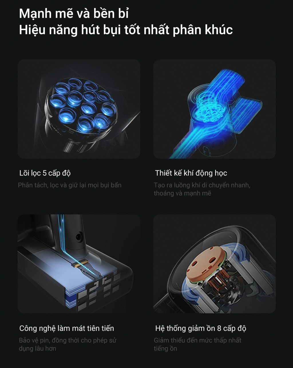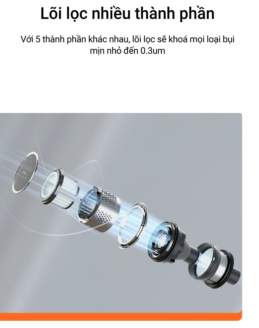 Công nghệ này được Dreame áp dụng trên sản phẩm của hãng sau khi nghiên cứu và chỉ ra rằng thiết bị có thể hút được những hạt bụi nhỏ đến 0.3 micromet, từ đó, Dreame đưa ra 5 cấp độ lọc bụi khác nhau, đi kèm với đó là thiết kế ống dẫn tách bụi đa điểm hình nón, thiết kế này cũng tạo ra khả năng lọc bụi, tách các dạng bụi khác nhau ngay cả trong quá trình bụi đi từ đầu ống hút đến khay chứa bụi.