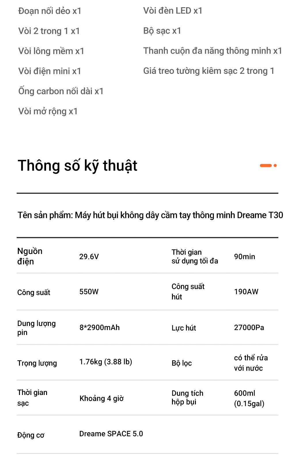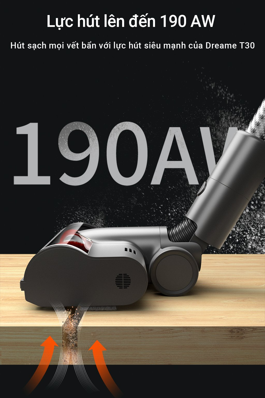 Theo Dreame, khối động cơ được trang bị trên Dreame T30 sở hữu lực hút lên đến 27000 Pa, công suất hút 190 AW, tốc độ xoay 150000 vòng/phút, khả năng làm việc liên tục trong 90 phút, tiếng ồn thấp và khả năng vận hành rất êm ái. Ngoài ra, người dùng có thể lưu ý một số các tính năng vượt trội khác của chiếc máy hút bụi Dreame T10 như: