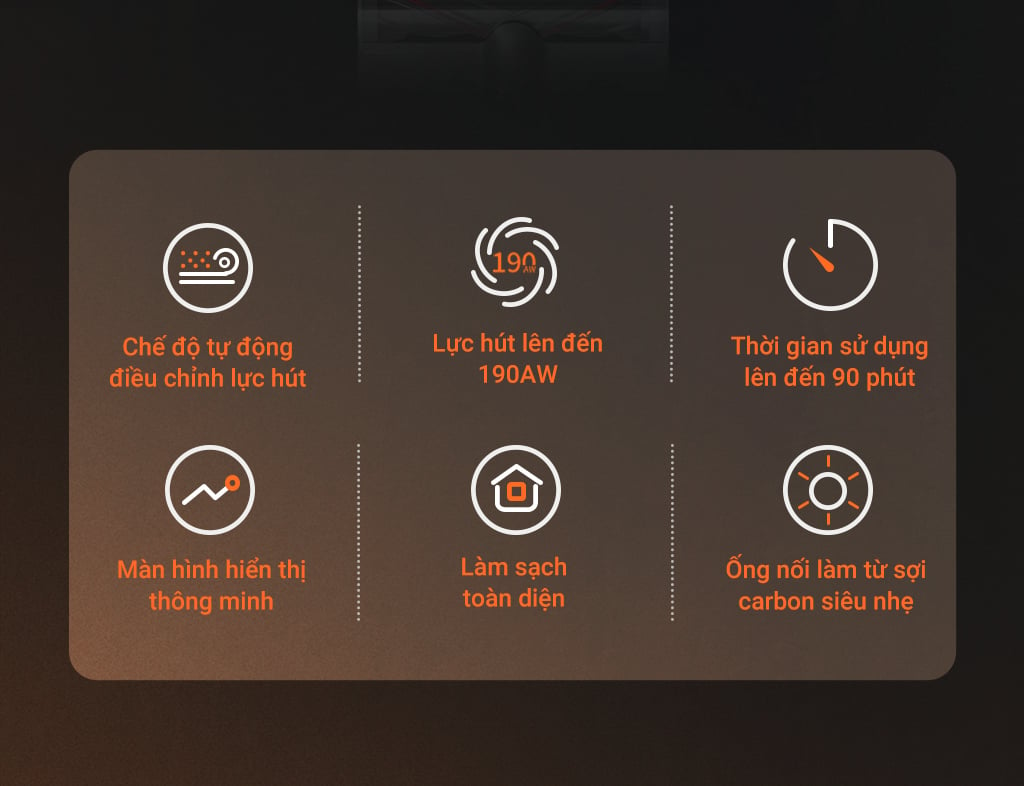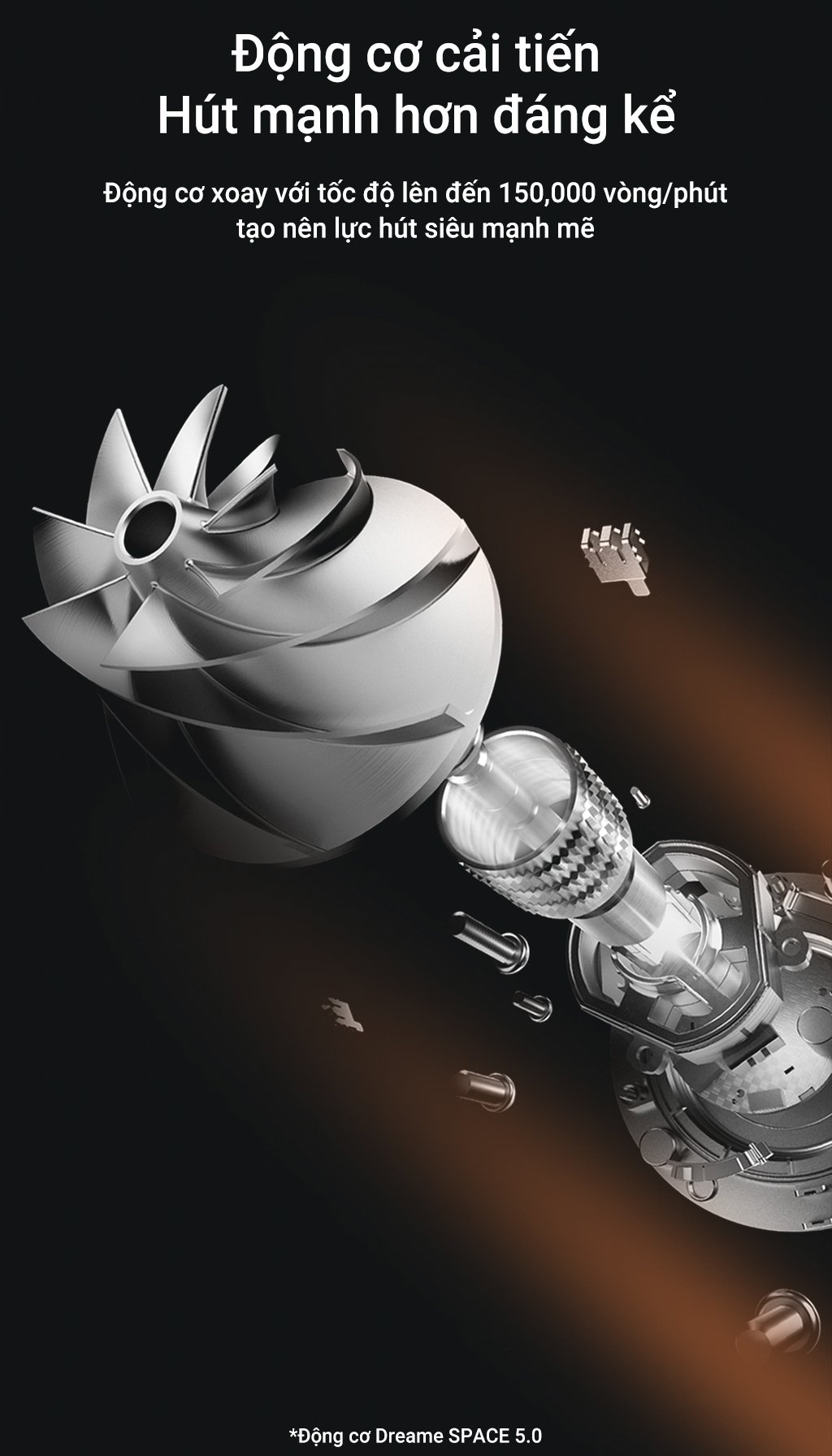 Dreame độc quyền động cơ hút công suất cao Space 5.0, với khả năng hoạt động chỉ trong 0.3 giây. Động cơ xoay đặt tốc độ 150000 vòng/phút giúp đảm bảo hút sạch mọi bụi bẩn, lông tóc và mảnh vụn nhanh chóng và hiệu quả. Ngoài ra, động cơ này còn có khả năng hoạt động liên tục trong thời gian dài, giúp người sử dụng làm sạch trên diện rộng.