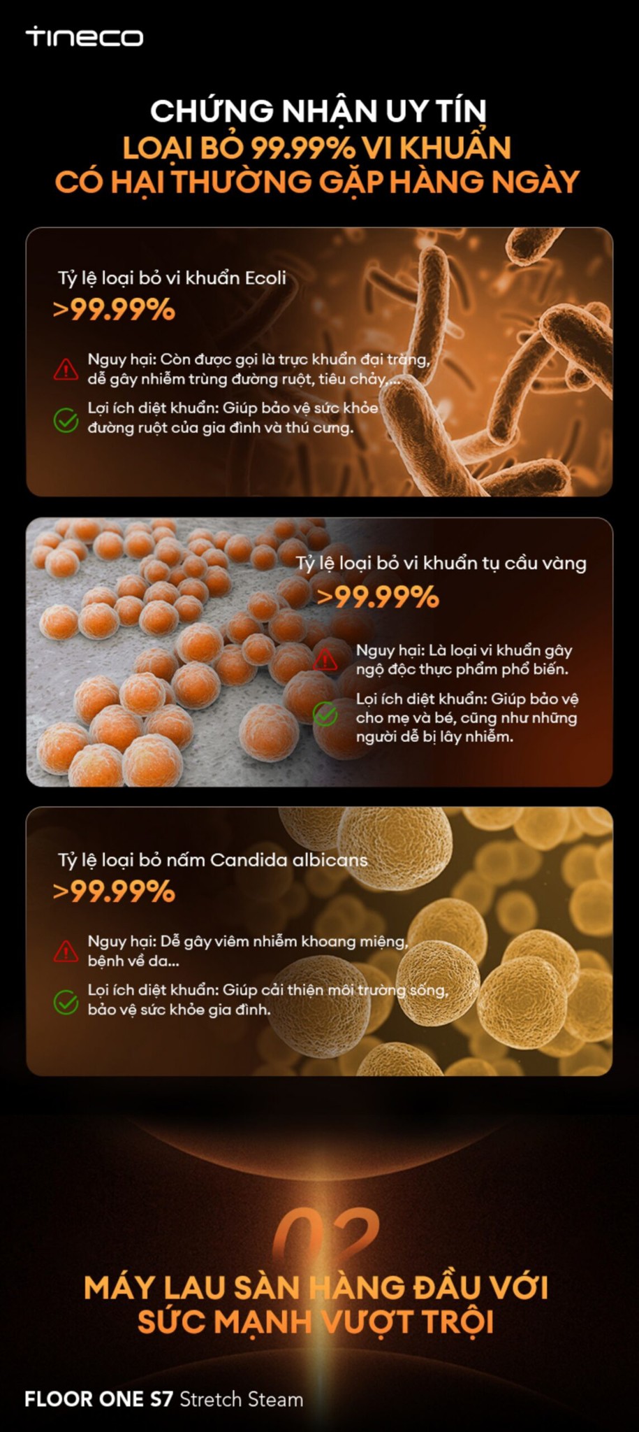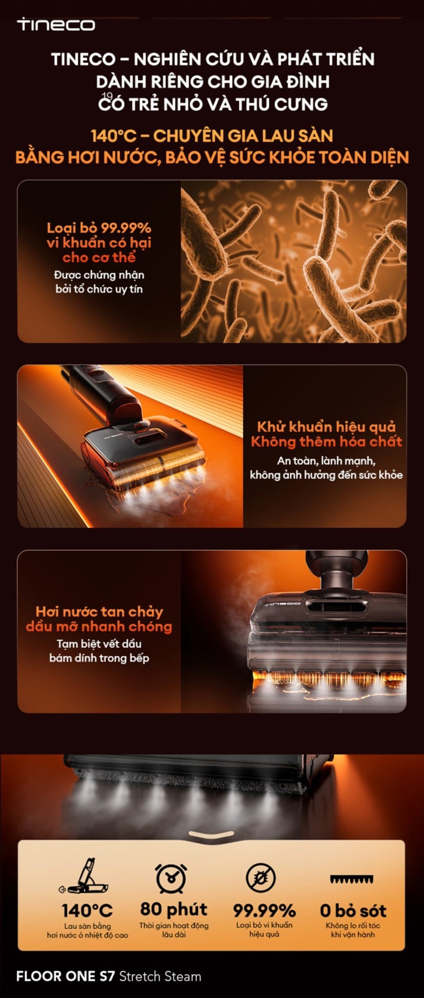 Tineco FLOOR ONE S7 Stretch Steam đã tạo nên một “cú nổ vang dội” khi đây là máy lau nhà đầu tiên sở hữu công nghệ làm sạch bằng hơi nước 140 độ, đánh bay mọi vết bẩn cứng đầu, đem lại hiệu quả làm sạch tối ưu nhất. Đầu tiên, máy hút bụi lau sàn khô ướt Tineco FLOOR ONE S7 Stretch Steam sở hữu thiết kế “tuyệt đối điện ảnh: khi sở hữu một màu đen sang trọng, cùng những đường cong tinh tế, giúp không gian nhà của bạn trở nên hiện đại hơn. Bên cạnh đó, nhờ có công nghệ HyperSteam 140 độ, Tineco FLOOR ONE S7 Stretch Steam có khả năng diệt khuẩn mạnh mẽ, loại bỏ hoàn toàn vi khuẩn và vết bẩn cứng đầu, mang lại không gian sống sạch sẽ và đảm bảo an toàn cho cả gia đình bạn.