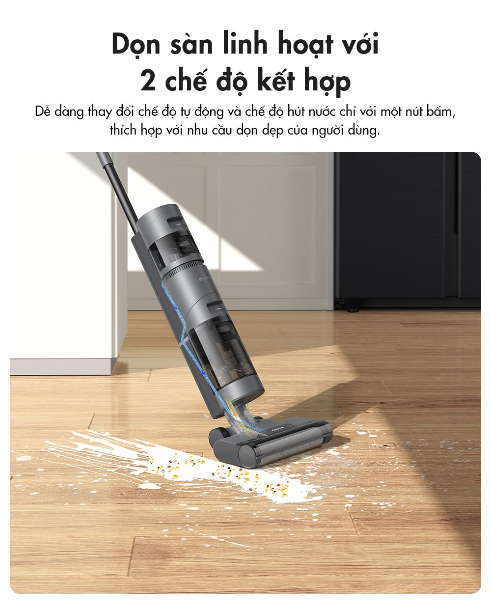 Với máy hút bụi lau sàn Dreame H12 Core, bạn có thể vệ sinh sàn nhà linh hoạt với 2 chế độ kết hợp (chế độ tự động và chế độ hút nước) chỉ với một nút bấm ngay tầm tay. Thiết bị có thiết kế thân máy gọn nhẹ và linh hoạt, kết hợp cùng bánh xe sau giúp người dùng dễ dàng di chuyển và tiếp cận các góc khuất khó vệ sinh.