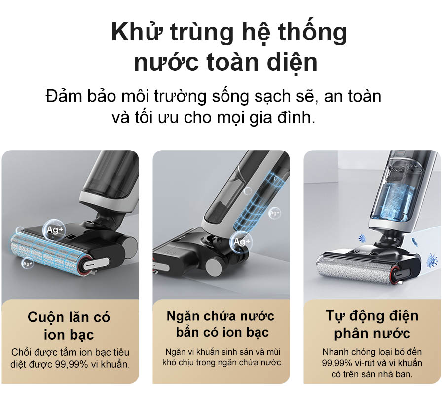 Dreame H14 tự hào với hệ thống khử trùng nước toàn diện tiên tiến, giúp loại bỏ ngay lập tức 99.99% vi khuẩn và virus trên sàn nhà của bạn thông qua quá trình điện phân nước. Đồng thời, bình nước sử dụng ion bạc giữ cho nước luôn sạch sẽ và không có mùi khó chịu. Trong khi đó, con lăn bàn chải cũng được pha trộn với ion bạc để chiến đấu chống lại 99.99% vi khuẩn. Hệ thống khử trùng nước toàn diện mang đến quy trình bảo vệ tối đa từ đầu đến cuối, mang lại môi trường sống sạch sẽ và an toàn cho gia đình bạn.