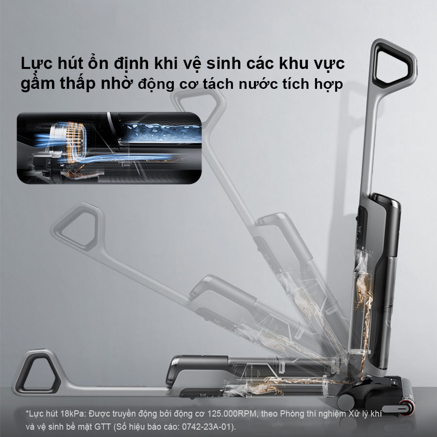 Máy hút bụi lau nhà Dreame H14 sở hữu động cơ mạnh mẽ với tốc độ vòng quay đạt 125.000 vòng/phút, cung cấp lục hút 18.000Pa. Điều này cho phép Dreame H14 xử lý được đa dạng các loại bụi bẩn, từ ướt đến khô, trên những bề mặt rộng hay trong những khe hẹp.