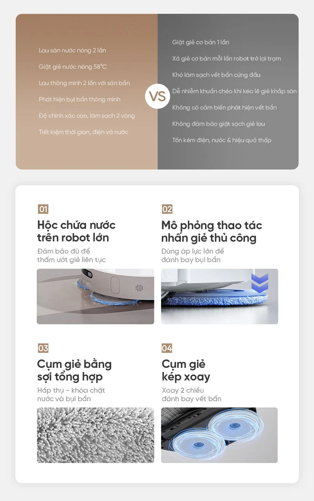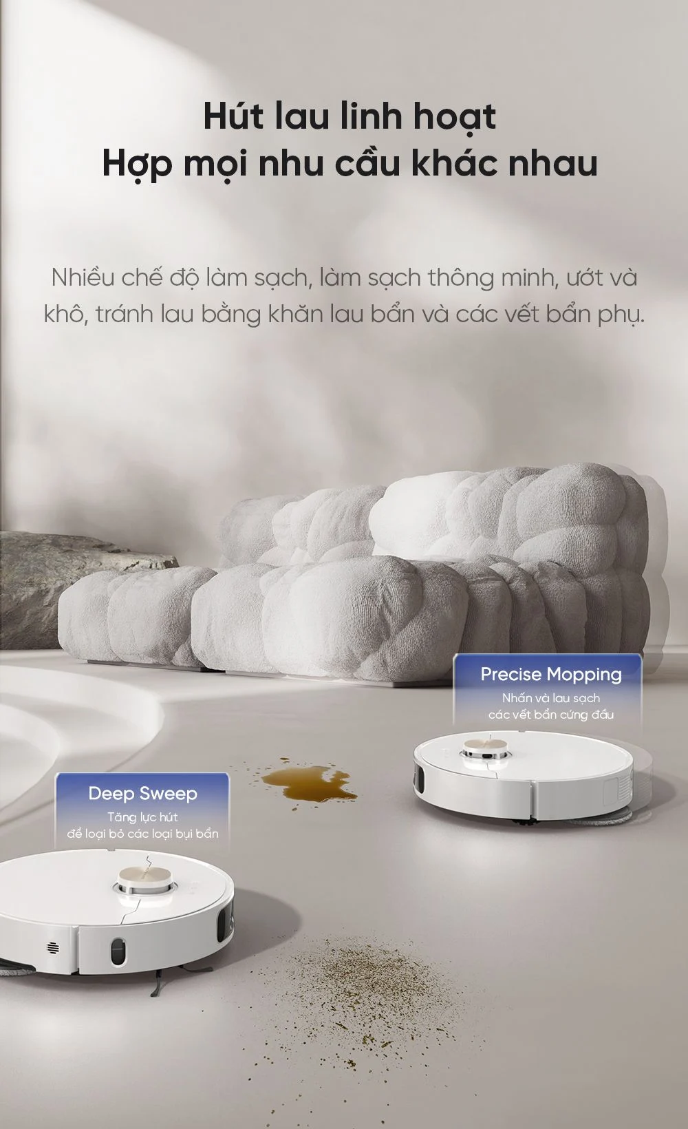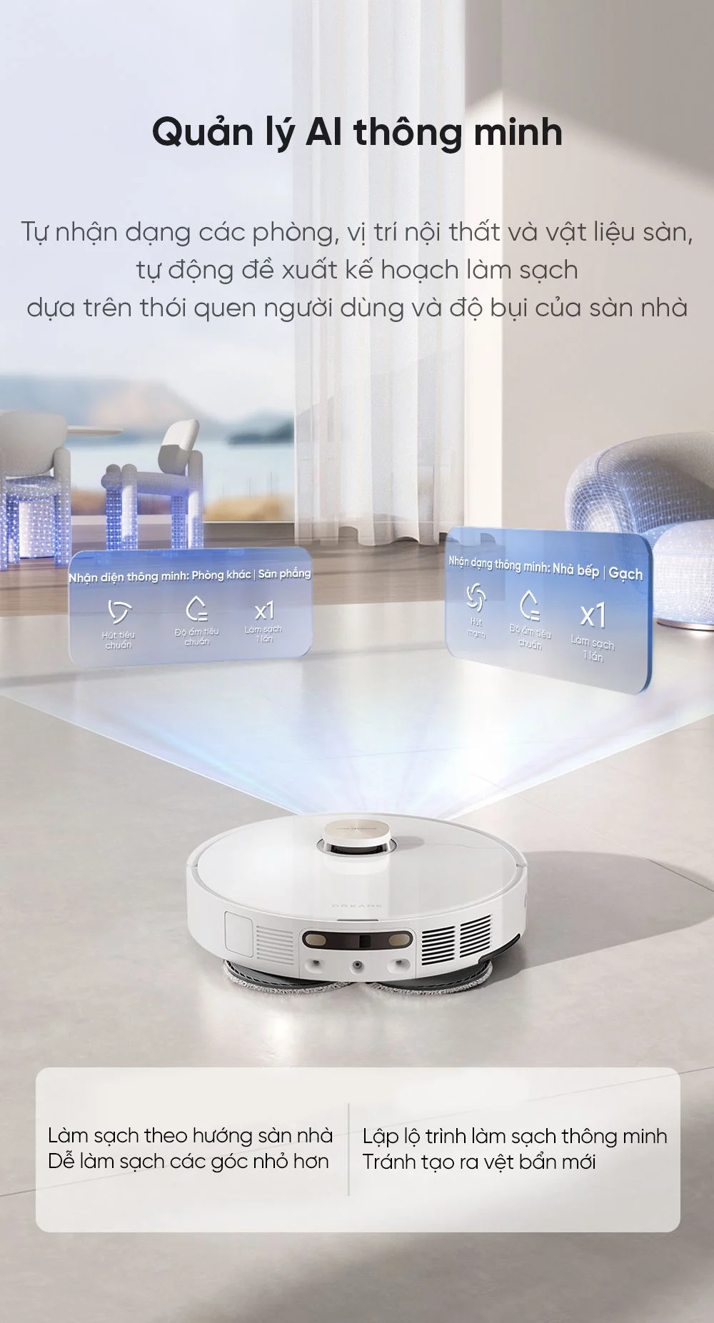 Robot sở hữu quy trình vận hành khép kín từ tự động hút bụi lau sàn, làm sạch hộp bụi, đổ bụi, giặt và sấy khô giẻ, tự pha dung dịch lau sàn, hỗ trợ bơm xả nước tự động, công nghệ điều hướng hỗ trợ AI tiên tiến, thuật toán vận hành CleanGenius… để việc dọn dẹp nhà cửa hàng ngày hoàn toàn tự động.