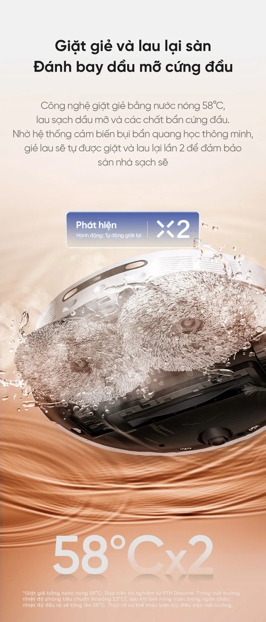 Điểm nổi bật nhất ở mẫu robot hút bụi lau sàn đa tính năng DreameBot L10s Pro Ultra Heat là tính năng tự giặt giẻ bằng nước nóng 58°C. Kết hợp cùng cảm biến bụi bẩn quang học thông minh, nếu sàn còn bẩn robot sẽ tự giặt và lau lại lần 2, đến khi loại bỏ hoàn toàn vết ố dầu và các vệt bẩn cứng đầu nhất.