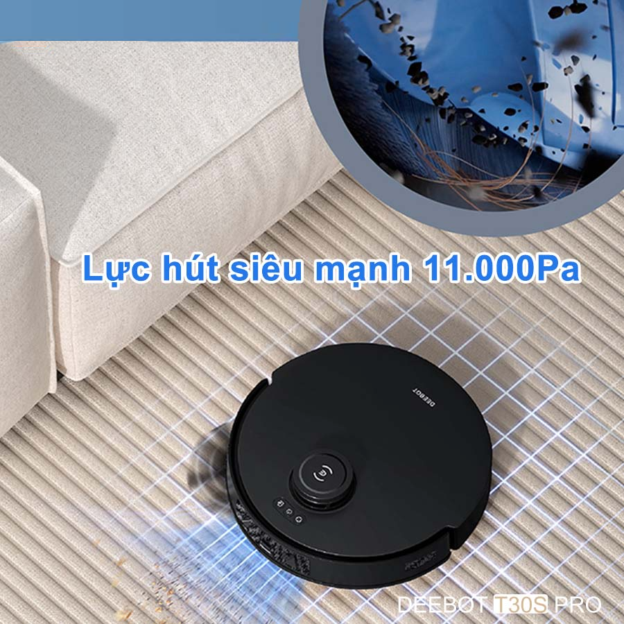 Ngoài ra, Deebot T30S Pro còn được trang bị công nghệ nhận diện thảm bằng sóng siêu âm, cho phép robot tự động điều chỉnh chế độ làm việc dựa trên từng loại bề mặt. Khi phát hiện thảm, tấm lau nhà sẽ tự động nâng cao đến 9mm để tránh làm ướt thảm, đồng thời tăng cường lực hút để loại bỏ bụi bẩn hiệu quả. Khi di chuyển trên sàn cứng, tấm lau sẽ hạ xuống để tiếp tục lau sạch sàn nhà. Nhờ vào tính năng này, Deebot T30S Pro mang lại sự an toàn và hiệu quả tối ưu trong quá trình làm sạch, đảm bảo sàn nhà của bạn luôn được chăm sóc chu đáo.