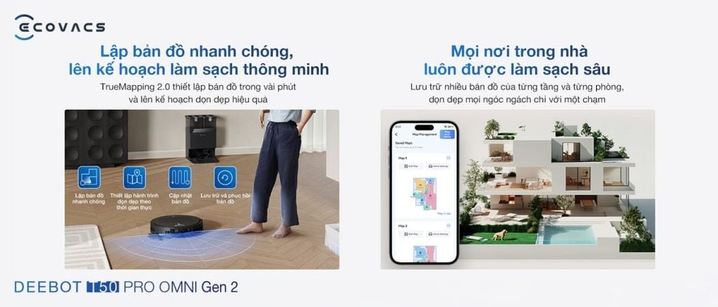 Được trang bị TrueMapping 2.0 - công nghệ lập bản đồ tiên tiến, robot hút bụi DEEBOT T50 PRO OMNI Gen 2 tạo ra sơ đồ nhà bạn cực kỳ nhanh chóng. Sau khi lập bản đồ, robot lên kế hoạch làm sạch hiệu quả, tối ưu hóa đường đi. Hệ thống còn hỗ trợ lưu nhiều bản đồ cho từng tầng hoặc từng khu vực trong nhà, linh hoạt trong quá trình làm sạch hàng ngày.