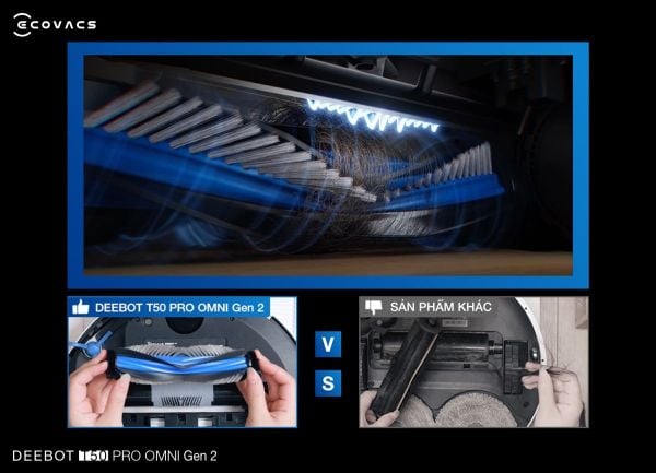 Công nghệ ZeroTangle 2.0 với cấu trúc bàn chải hình chữ V ba lớp độc đáo, nhằm hạn chế tối đa tình trạng tóc dài quấn vào cuộn chải. Robot hút bụi Ecovacs DEEBOT T50 PRO OMNI Gen 2 có thể xử lý tốt nhiều bề mặt như sàn gỗ, gạch men, thảm… kể cả những khu vực thường xuyên có tóc rơi. Khi lượng tóc rối giảm xuống mức gần như bằng 0%, robot duy trì hoạt động ổn định trong thời gian dài, không gặp hiện tượng kẹt chổi hay gián đoạn quá trình dọn dẹp.