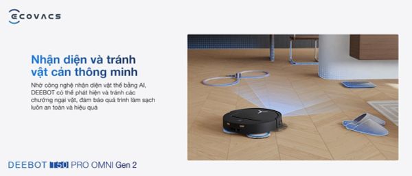 Công nghệ AIVI 3D 3.0 là sự kết hợp giữa ánh sáng cấu trúc 3D cùng camera RGB để tạo bản đồ 3D chi tiết cho toàn bộ không gian trong nhà. Cho phép robot hút bụi lau nhà Ecovacs T50 PRO OMNI Gen 2 hiểu hình ảnh bằng trí tuệ nhân tạo, nhận diện chính xác nhiều loại vật cản như đồ dùng nhỏ, thú cưng, dây điện hoặc vật thể đặt ở vị trí thấp. Khi phát hiện chướng ngại, robot tự điều chỉnh hướng di chuyển để tránh va chạm, bảo vệ máy lẫn nội thất xung quanh.