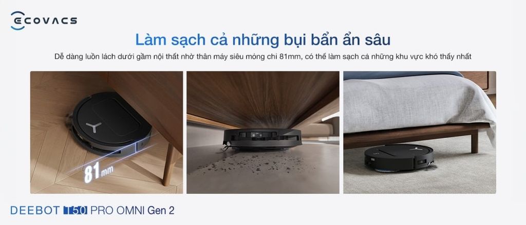 Sở hữu thiết kế mỏng chỉ 81mm, kiểu dáng thấp, robot hút bụi lau nhà T50 PRO OMNI Gen 2 dễ dàng luồn sâu vào gầm giường, tủ, sofa, xử lý trọn vẹn bụi mịn lẫn rác nhỏ tại những vùng tay khó chạm tới. Cấu trúc mỏng kết hợp khả năng vượt vật cản 20mm, thêm cơ chế nâng giẻ lau 9mm, tạo điều kiện để robot di chuyển ổn định trên nhiều loại sàn.