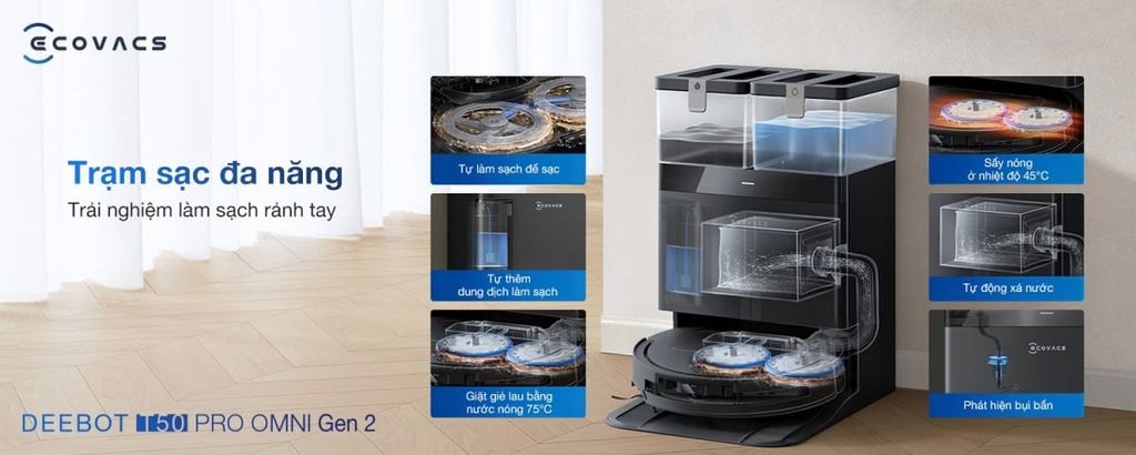 Trạm OMNI đa năng trên DEEBOT T50 PRO OMNI Gen 2 tạo nên trải nghiệm dọn dẹp gần như rảnh tay.