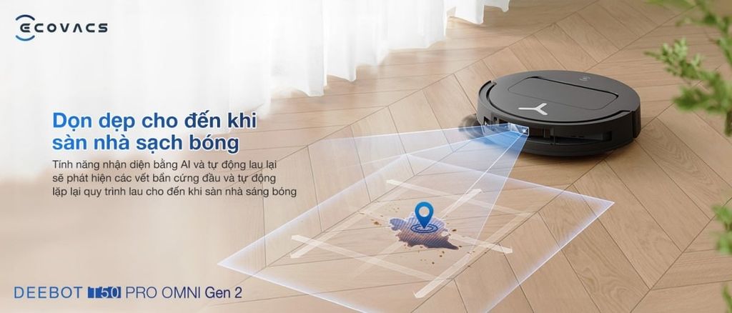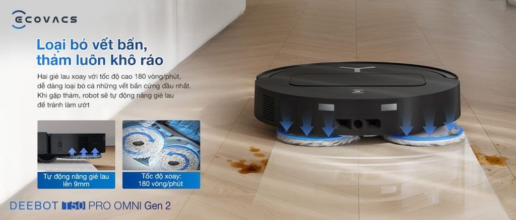 Với các chuyển động xoay mạnh mẽ, DEEBOT T50 PRO OMNI Gen 2 xử lý hiệu quả các vết bẩn bám chặt trên bề mặt sàn. Hệ thống mô-đun lau quay liên tục gia tăng lực ép lên sàn, từ đó đánh bật bụi bẩn khô, dấu chân, vệt nước đọng hoặc cặn bám lâu ngày. Nhờ cơ chế xoay tốc độ cao, robot duy trì độ sạch đồng đều trên toàn bộ bề mặt, kể cả khu vực thường xuyên chịu tác động như bếp hay lối ra vào.