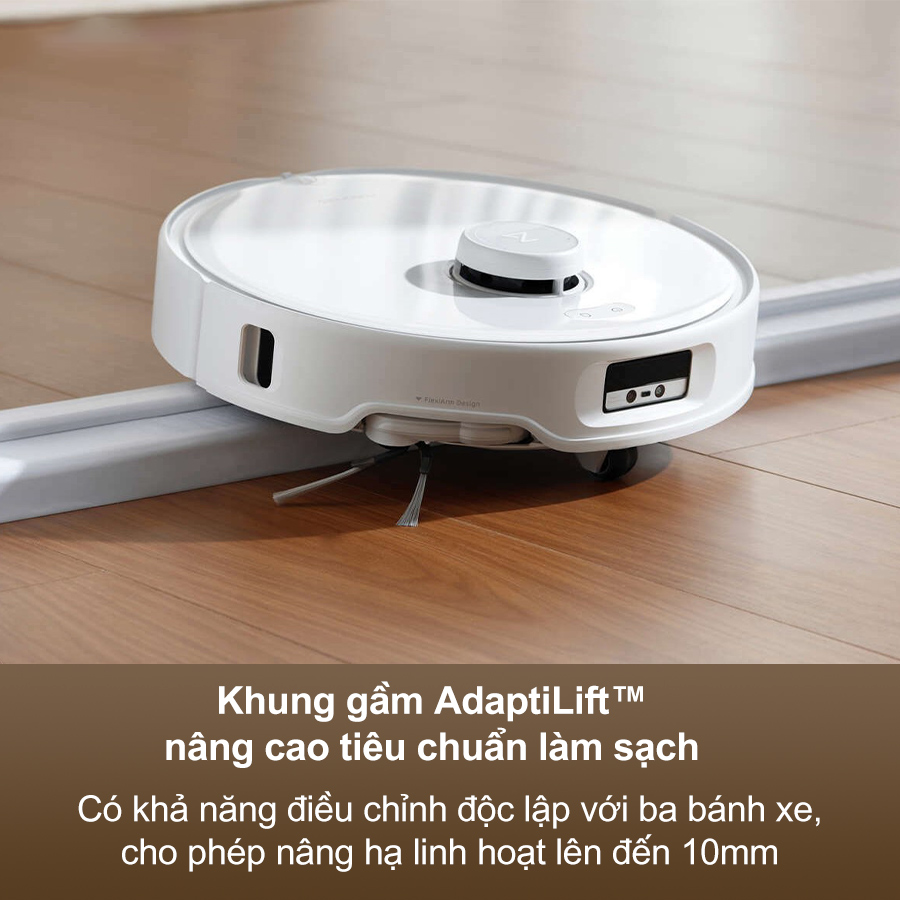 Roborock Q Revo Curv được trang bị khung gầm AdaptiLift™ tiên tiến, lần đầu tiên xuất hiện trong các sản phẩm robot hút bụi. Khung gầm này có khả năng điều chỉnh độc lập với ba bánh xe, cho phép nâng hạ linh hoạt lên đến 10mm. Bạn có thể nâng toàn bộ khung gầm hoặc chỉ nâng các phần trước, sau, trái, phải để thích nghi với mọi điều kiện sàn nhà. Với khả năng vượt qua các chướng ngại vật và xử lý nhiều loại sàn khác nhau, khung gầm AdaptiLift™ đảm bảo việc dọn dẹp diễn ra suôn sẻ và hiệu quả.