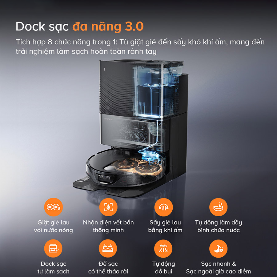 Trạm sạc có chức năng tự động hút bụi từ hộp chứa trên robot lên túi rác trên dock sạc, giúp bạn không cần phải đổ rác liên tục, với dung tích đủ dùng lên đến 7 tuần. Ngoài ra, hệ thống tự động nạp nước vào bình chứa của robot, giúp quy trình làm sạch trở nên liên tục và tiện lợi hơn.