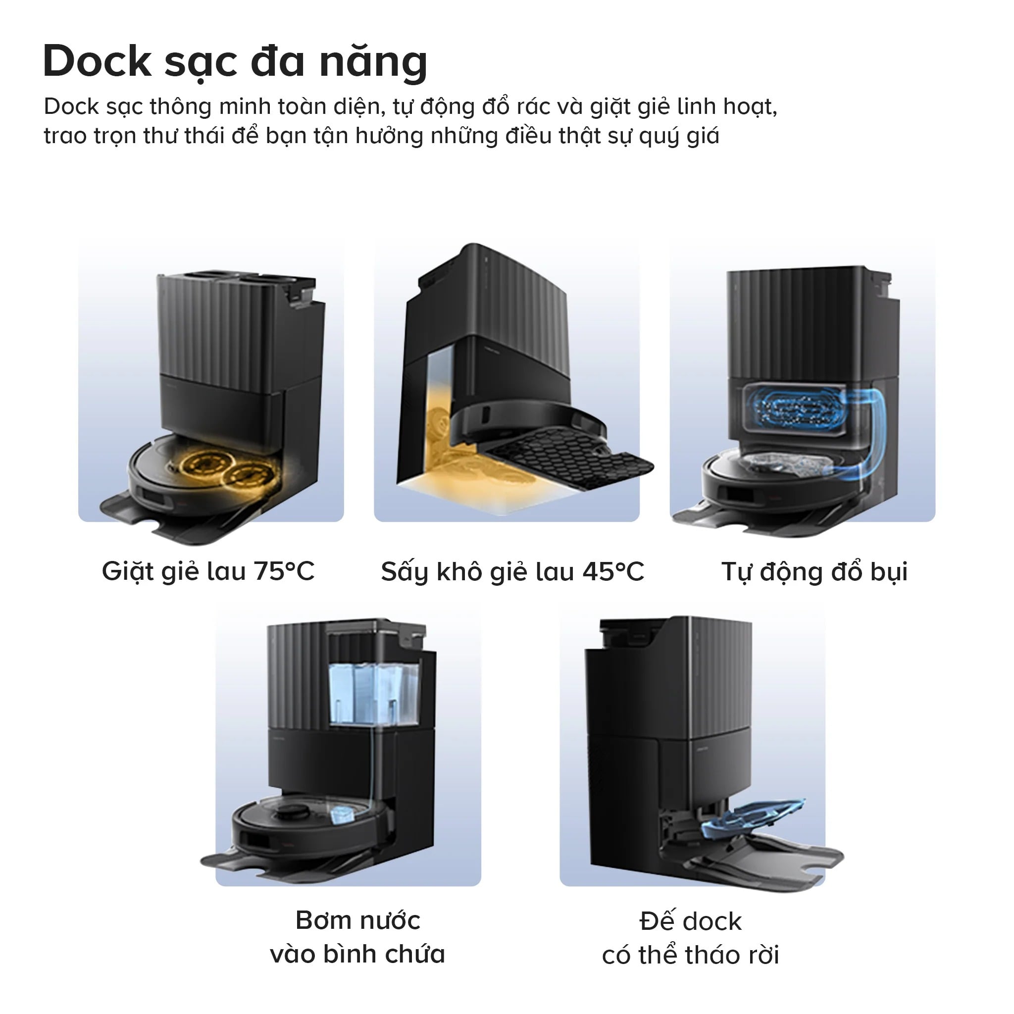 Điểm nhấn giá trị nhất của Roborock Qrevo S Pro nằm ở trạm sạc đa năng (Dock sạc), nơi thực hiện một chu trình bảo dưỡng khép kín cho robot mà không cần bạn phải can thiệp.