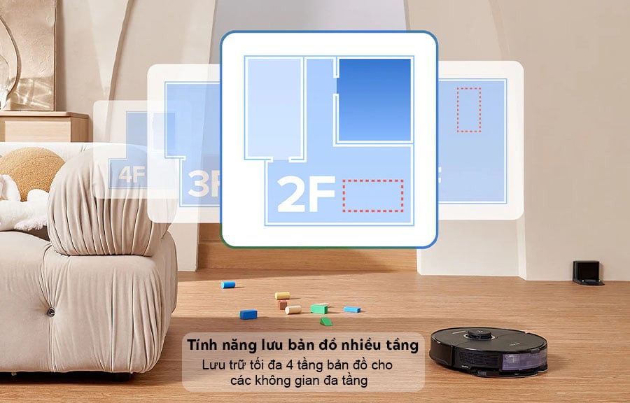 Roborck S8 có khả năng thiết lập bản đồ 3D ngôi nhà bạn một cách chính xác, giúp tối ưu công việc dọn dẹp. Đặc biệt, Roborock S8 còn có thể lập bản đồ đa cấp, tự động nhận dạng các tầng khác nhau trong nhà của bạn và hỗ trợ lưu đến 4 bản đồ