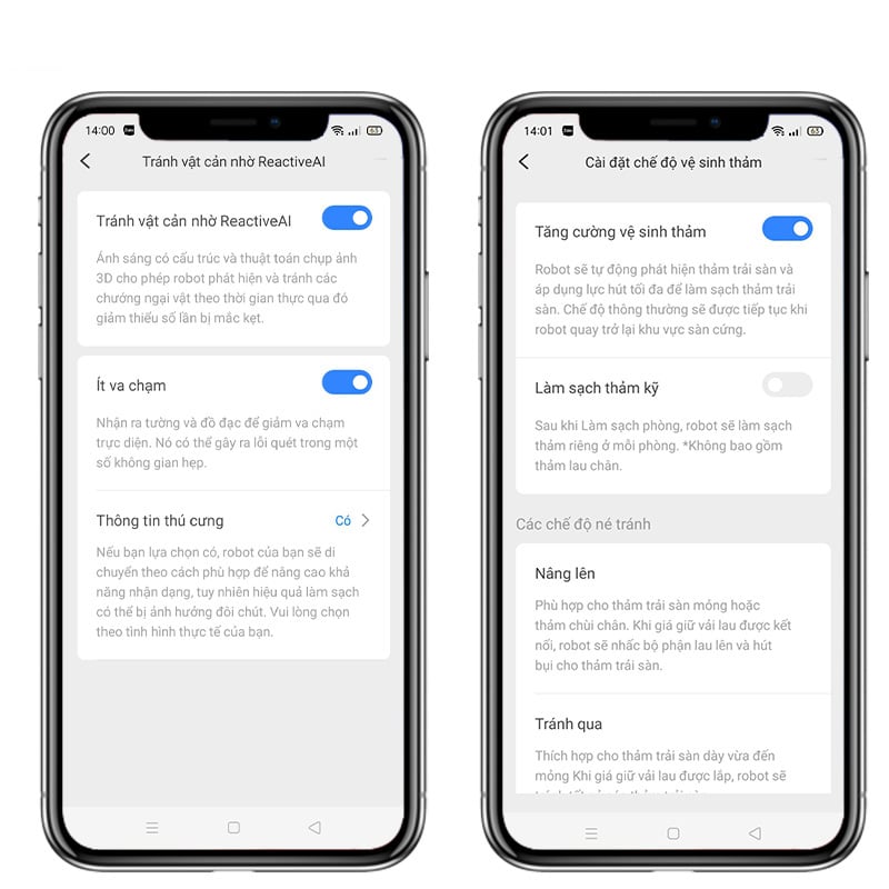 Để đảm bảo Roborock S8 hoạt động hiệu quả và tối ưu nhất, hãy bật chức năng TRÁNH VẬT CẢN REACTIVE AI. Chế độ này cho phép robot nhận diện được chính xác các chướng ngại vật trên sàn và né tránh một cách linh hoạt. Bên cạnh đó, chế độ CÀI ĐẶT VỆ SINH THẢM cũng rất hữu ích, nhất là với những gia đình có nuôi thú cưng. Roborock S8 sẽ nhận diện các khu vực có thảm và tăng cường công suất, giúp loại bỏ lông thú cưng và bụi bẩn từ sợi thảm hiệu quả.