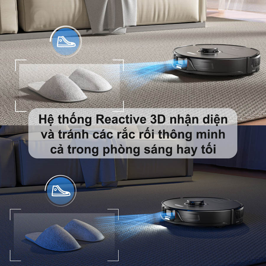 - Hệ thống tránh chướng ngại vật 3D: Sử dụng công nghệ hình ảnh hồng ngoại và ánh sáng có cấu trúc 3D để robot nhận biết và tránh các đồ vật trên sàn nhà.