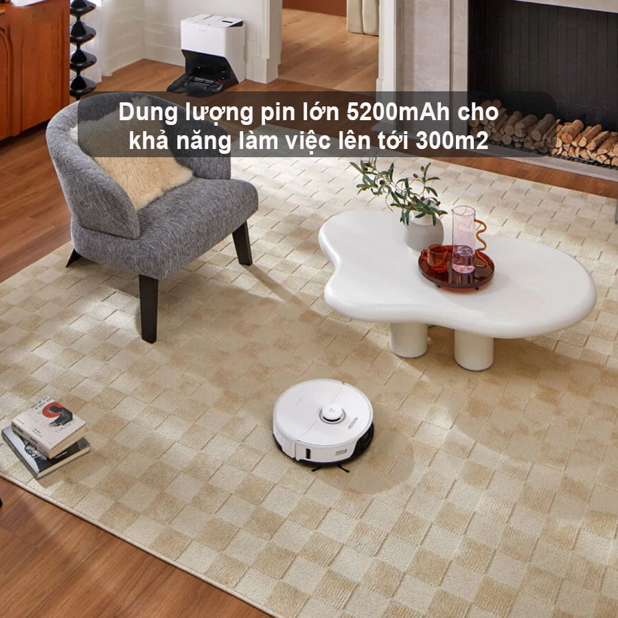 5.200 mAh và cho khả năng dọn dẹp phòng lên đến 300m2(trong điều kiện tiêu chuẩn) với một lần sạc. Kết hợp với một hệ thống