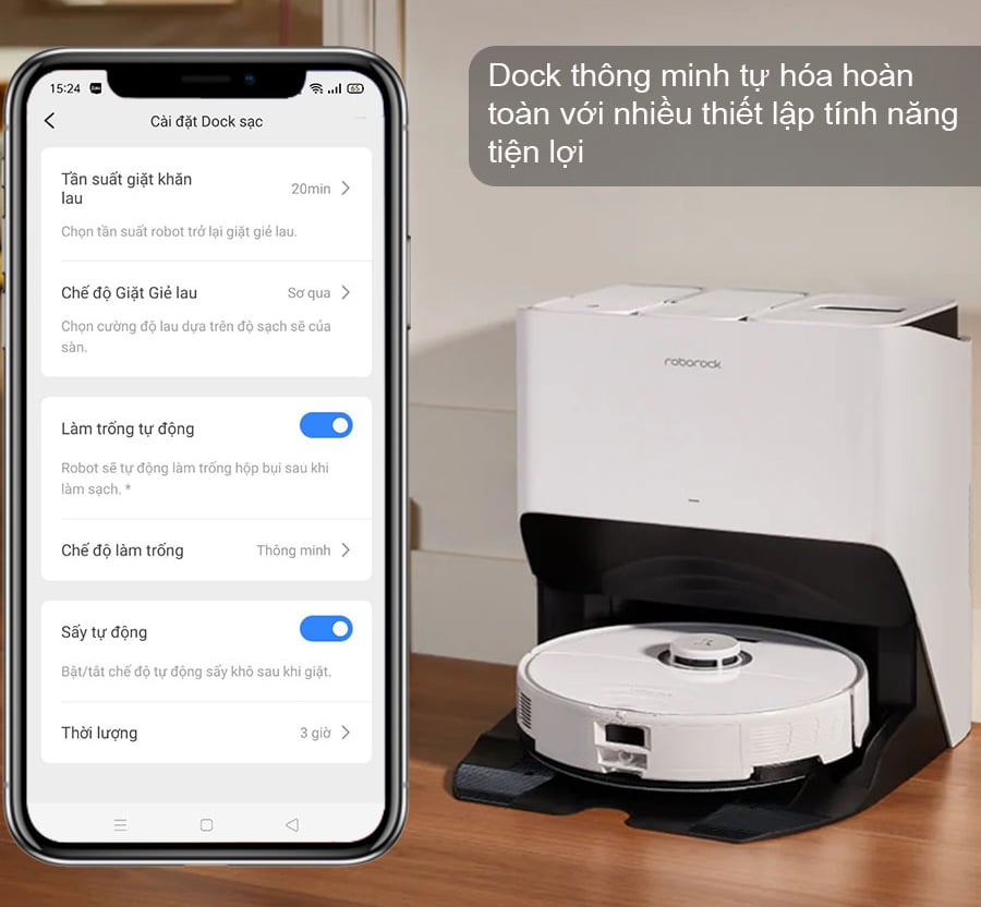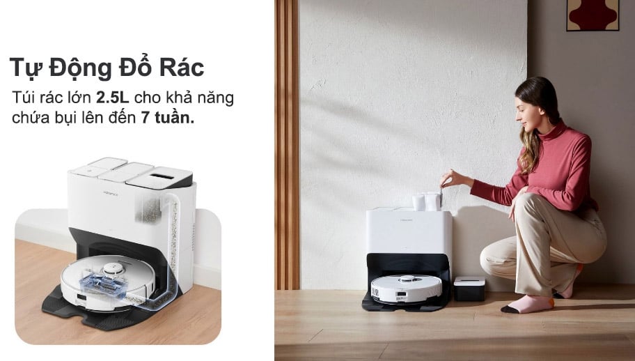 - Sở hữu trạm sạc đa năng tự giặt, sấy khô khăn, tự động đổ rác và bơm nước vào trong hộp tiện lợi và nhanh chóng.