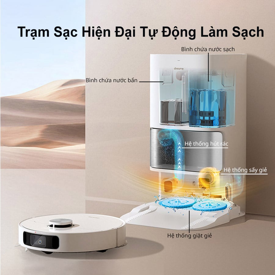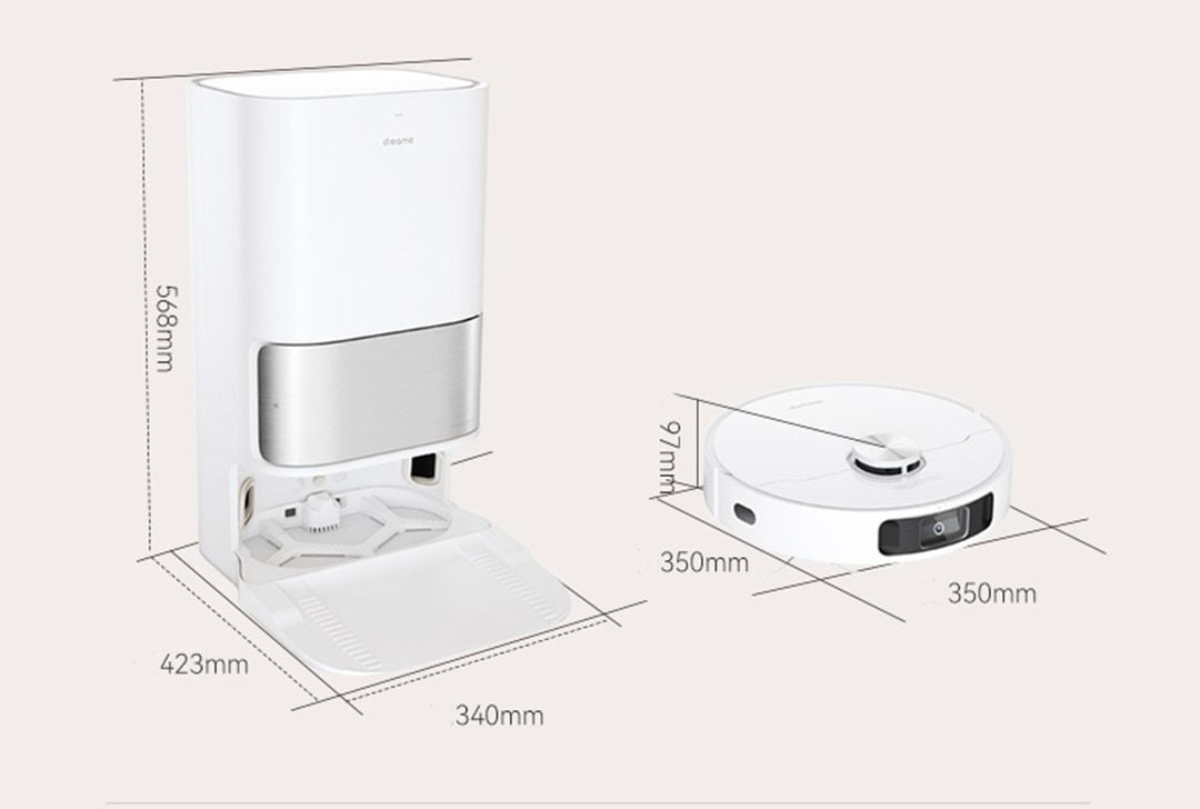 - Dock sạc hoàn toàn mới : hệ thống làm sạch gồm 1 bình chứa rác 3L, bình chứa nước sạch và nước bẩn có dung tích là 2.5 L. Ngoài ra bình chưa nước có thể kết hợp với bơm xả nước tự động (phụ kiện bán rời) để tự động cung cấp cũng như xả nước bẩn trong bình chứa