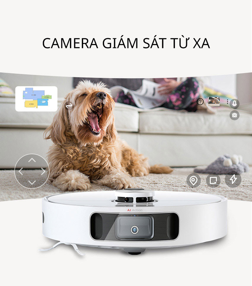 - Hệ thống camera Ai Action : cho phép robot dễ dàng né tránh đồ nội thất trong nhà một cách dễ dàng và chính xác. Ngoài ra hệ thống còn tạo bản đồ ứng dụng 3D giúp bạn có thể theo dõi giám sát một cách nhanh chóng các độ vật trong nhà.