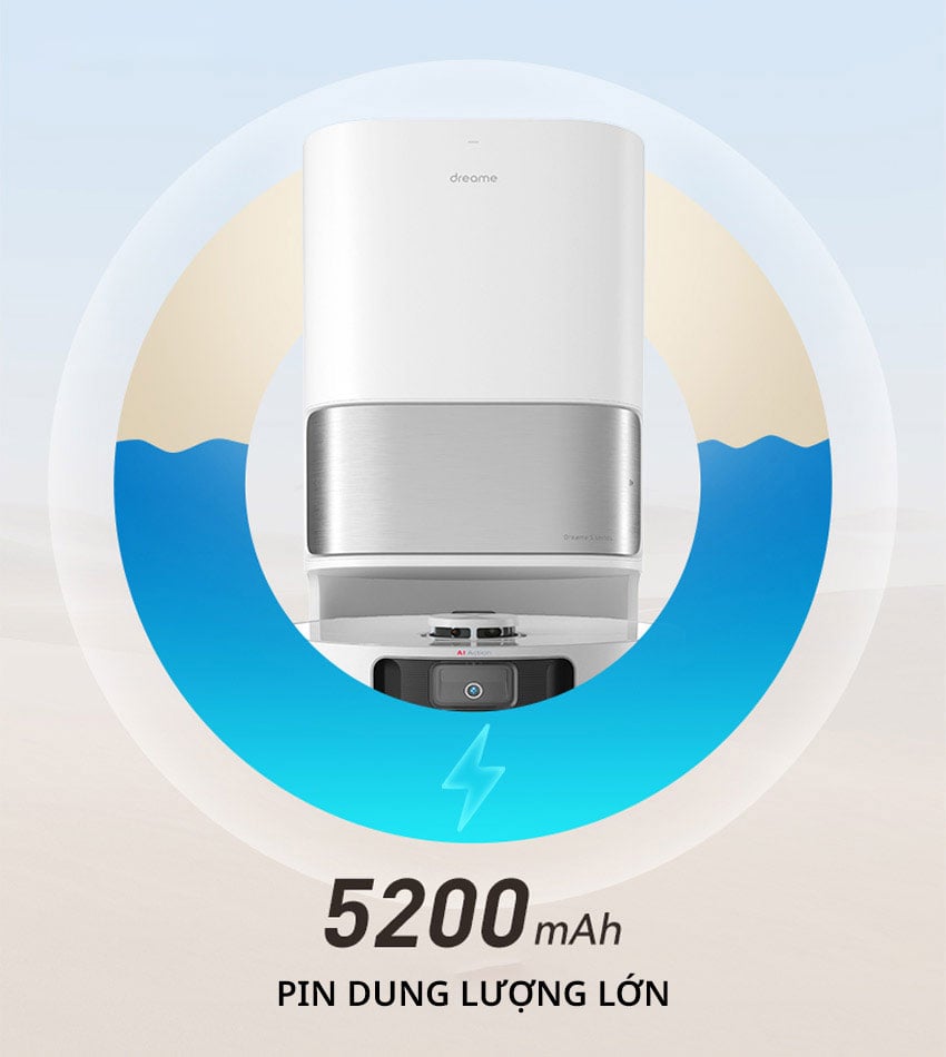 - Pin lớn, lực hút mạnh: trang bị viên pin 5200mAh cho lực hút 5300Pa dễ dàng làm sạch diện tích phòng lên tới 200m2 với chế độ tiêu chuẩn.